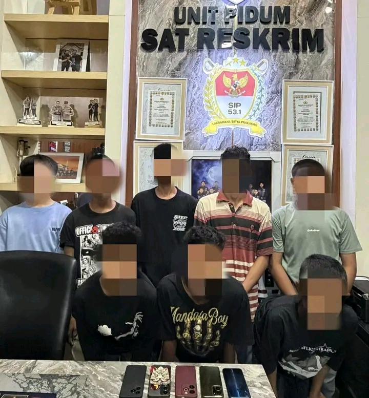 KUALATUNGKAL Lj – Delapan orang terduga pelaku pengeroyokan yang terjadi di Jalan Siswa dalam Kota Kuala Tungkal, malam pertama arakan sahur Ramadhan, kini terpaksa berurusan dengan hukum. Pasalnya, delapan terduga pengeroyokan tersebut, malam itu juga berhasil dibekuk Tim Opsnal Tipidum Satreskrim Polres Tanjung Jabung Barat, Sabtu malam (21/02/2026). Kapolres Tanjab Barat AKBP Maulia Kuswicaksono,SIK,MH melalui Kasat Reskrim AKP Frans Septiawan Sifayung, S.Tr.K., mengatakan penangkapan delapan orang terduga dalam pelaku pengeroyokan warga di Jalan Siswa pada malam pawai arakan sahur tersebut dipimpin langsung oleh Kanit Pidum IPDA Peri S, S.H., dimulai pukul 23.30 WIB hingga selesai. Dijelaskan dia, Peristiwa pengeroyokan ini menimpa korban atas nama Muhammad Amin Insiden terjadi pada tanggal 11 Februari 2026 sekitar pukul 23.30 WIB di Jl. KH. Dewantara RT 15, Kelurahan Patunas, Kecamatan Tungkal Ilir, Kabupaten Tanjung Jabung Barat pada saat pawai arakan sahur berlangsung. Setelah menerima laporan, lanjut dia pihaknya langsung melakukan penyelidikan mendalam. Selang beberapa jam, Tim Opsnal Tipidum mendapatkan informasi akurat mengenai keberadaan para pelaku. Petugas bergerak cepat melakukan pengejaran di lapangan.