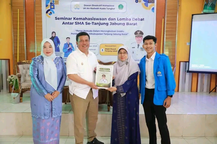 Kuala Tungkal Lj – Wakil Bupati Tanjung Jabung Barat Dr. H. Katamso, SA, SE, ME menghadiri sekaligus menjadi Narasumber pada Seminar Kemahasiswaan dan Lomba Debat Antar SMA Se Tanjung Jabung Barat dengan tema “Peran Pemuda Dalam Meningkatkan Indeks Pembangunan Dikabupaten Tanjung Jabung Barat”, Minggu (16/11). Kegiatan yang di laksanakan di Aula IAI An-Nadwah Kuala Tungkal dibuka langsung oleh Dr. Nurul Hidayah Tumadi, Lc, M. A selaku Wakil Rektor III Bidang Kemahasiswaan IAI An-Nadwah Kuala Tungkal dan turut dihadiri oleh Ketua Prodi Hukum Keluarga Islam (HKI) Dr. Heryani, S.Th.I M.Sy IAI An-Nadwah Kuala Tungkal, para Siswa-siswi SMA Se Kabupaten Tanjung Jabung Barat, serta para Mahasiswa IAI An-Nadwah Kuala Tungkal. Dalam penyampaiannya, Wabup Katamso sampaikan tentang Indeks Pembangunan Manusia (IPM) dan Perekonomian di Kabupaten Tanjung Jabung Barat. Ia mengapresiasi kepada Mahasiswa IAI An-Nadwah Kuala Tungkal di bawah bimbingan Wakil Rektor III serta Ketua Prodi HKI sehingga anak-anak IAI An-Nadwah memiliki kesadaran yang tinggi serta rasa cinta terhadap Kabupaten Tanjung Jabung Barat.”Kegiatan seminar yang dilaksanakan Mahasiswa IAI An-Nadwah Kuala Tungkal tersebut menunjukkan bahwa ada perhatian dan ada niat dari pemuda-pemuda kita untuk berkolaborasi bersama Pemerintah dalam melaksanakan proses pembangunan di Kabupaten Tanjung Jabung Barat ini,” ucap Wabup.(Adv)