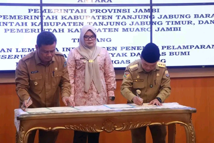 Jambi Lj – Wakil Bupati Tanjung Jabung Barat, Dr. H. Katamso, S.A., S.E., M.E., menandatangani komitmen bersama antara Pemerintah Provinsi Jambi dengan Pemerintah Kabupaten Tanjung Jabung Barat, Kabupaten Tanjung Jabung Timur, dan Kabupaten Muaro Jambi. Komitmen tersebut berkaitan dengan Penetapan Lembaga Independen Penentu Pelamparan Reservoir Cadangan Minyak dan Gas Bumi di Wilayah Kerja (WK) Migas Jabung dan Migas Lemang, Selasa (4/11). Kegiatan yang berlangsung di Aula VIP Auditorium Rumah Dinas Gubernur Jambi ini turut dihadiri oleh Gubernur Jambi, Bupati Tanjung Jabung Timur, Kepala OPD terkait, pimpinan BUMD, para Kepala Bagian Ekonomi dan Kepala Bagian SDA lingkup Setda Provinsi Jambi, serta tamu undangan lainnya. Sebagaimana diatur dalam Permen ESDM Nomor 37 Tahun 2016 dan Permen ESDM Nomor 01 Tahun 2025, PT Jambi Indoguna Internasional (PT JII) telah menerima penawaran dari beberapa lembaga independen dan menetapkan kesepakatan kerja dengan PT Paleopetro sebagai lembaga independen yang melakukan kajian teknis dan ekonomis terhadap Participating Interest (PI) 10% di WK Jabung. Hasil kajian lembaga independen tersebut menjadi dasar penentuan pelamparan reservoir cadangan minyak dan gas bumi di WK Migas Jabung, serta menjadi acuan dalam penetapan besaran kepemilikan saham antara Pemerintah Kabupaten Tanjung Jabung Barat, Tanjung Jabung Timur, dan Muaro Jambi. Gubernur Jambi, H. Al Haris, dalam arahannya menyampaikan bahwa PT Paleopetro yang telah ditunjuk sebagai Lembaga Independen Penentu Pelamparan Reservoir Cadangan Minyak dan Gas Bumi di WK Migas Jabung dan Migas Lemang merupakan lembaga yang dinilai layak dan memenuhi kriteria baik dari segi administrasi, kemampuan teknis, maupun sumber daya manusia.“Menurut saya, tim harus bekerja lebih cepat dan lebih baik. Waktu perlu dipercepat, dan jangan sampai Participating Interest (PI) 10% dijadikan alat negosiasi. Kita harus tegas memperjuangkan hak 10% tersebut,” tegas Gubernur Al Haris. Sementara itu, Wakil Bupati Tanjung Jabung Barat, Dr. H. Katamso, S.A., S.E., M.E., dalam sesi dengar pendapat menyampaikan apresiasinya atas terlaksananya kesepakatan bersama tersebut. Ia menilai langkah percepatan ini sangat baik di tengah upaya efisiensi yang sedang dilakukan saat ini. Pemerintah Kabupaten Tanjung Jabung Barat, lanjutnya, mendukung sepenuhnya seluruh program yang ada, termasuk nantinya dalam pembagian saham.“Atas nama pribadi dan Pemerintah Kabupaten Tanjung Jabung Barat, saya mengapresiasi upaya percepatan ini. Kami mendukung penuh, semakin cepat semakin baik, dan tentunya sesuai dengan peraturan perundang-undangan yang berlaku,” ujar Wabup Katamso.(Adv)